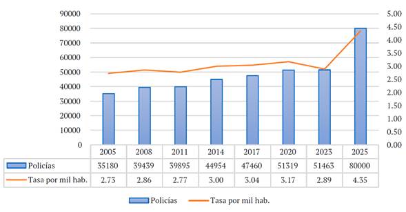 4A finales del 2024, la meta de crecimiento del numérico policial no se ha cumplido como se ha propuesto, aunque se estima que el número actual es cercano a los 60 000 miembros.