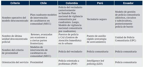 Desde una perspectiva comparada, el MGDCOC en Ecuador tiene similitudes y diferencias importantes en su concepción. Estos modelos policiales han tomado diversos nombres. Tal como se puede observar en la Tabla 1, en Colombia, por ejemplo, se le denomina “policía de vecindario”, en Perú “vecindarios seguros” y en Ecuador el actual sistema de policía comunitaria se pasará a denominar “policía de barrio”. La orientación del servicio policial de cercanía cambia en cada país. En el caso de Chile, solo le denominan “policía de proximidad”. En Colombia, por su parte, la gestión se establece en el modelo de “policía orientada a problemas (POP)”, en Perú hacia un modelo de intelligence led policing (LED) y en Ecuador al modelo de “policía comunitaria”. Una característica fundamental del modelo ecuatoriano radica en que este es el modelo de desconcentración operativa y de servicios más radical comparado con otros países, pues las UPC funcionan como unidades de provisión de servicios policiales y con un alto nivel de autonomía operativa. En Colombia, actualmente el servicio de los Centros de Atención Inmediata (CAI) solo actúan como centros de despacho de servicios policiales, pero no funcionan como lugares de residencia.