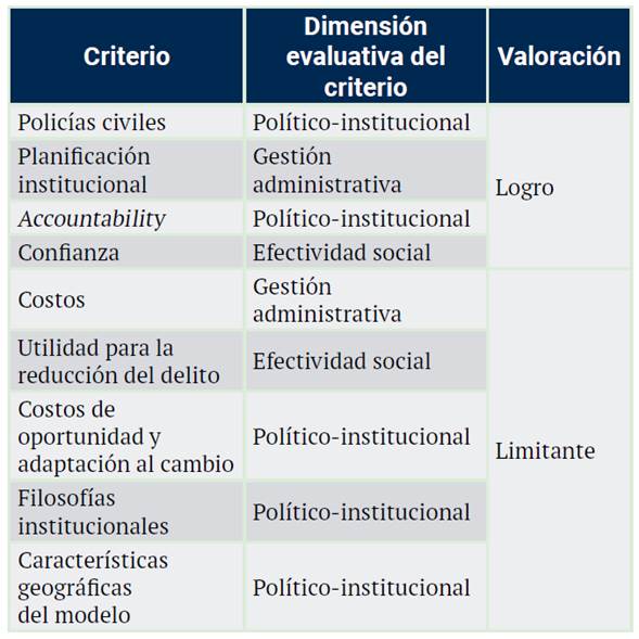 En síntesis, el modelo de policía comunitaria ha sido una apuesta gubernamental e institucional para hacer frente al problema del delito y la inseguridad, lo cual ha apalancado cambios estructurales y operativos en la policía de la región en contextos democráticos. No obstante, luego de tres décadas de adopción de este modelo en la región, es necesario hacer una valoración crítica de la pertinencia y el alcance del modelo analizado, así como de sus pros y sus contras.