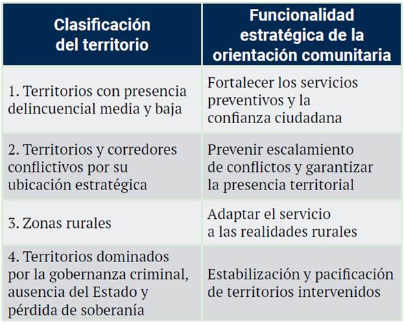 Esta situación se acentúa mucho más con la emergencia de nuevas modalidades delictivas organizadas, dedicadas al manejo de mercados criminales altamente violentos y de control territorial. Como se ha visto, esto ha minado la credibilidad de la valía de la orientación comunitaria. La filosofía de un policía amigo de la comunidad, con sentido de pertenencia, y con técnicas de resolución de conflictos, se ha empezado a ver como una estrategia demasiado blanda y benévola ante el embate de las organizaciones altamente peligrosas.
