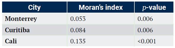 Authors’ contribution:Cipagauta-Díaz coordinated the research, planned and organised the activities and acted as editor of the text; Jiménez-García designed the methodology, structured the theoretical framework, conducted the spatial analysis and drafted the manuscript; Mandujano-Montoya led the analysis of the Monterrey section, contextualized findings, verified figures and contributed to the conclusions; Sentone conducted the Curitiba analysis, contextualised findings, verified figures and contributed to the discussion of results; Garcia supported the geographical and spatial analysis; Marulanda revised the style, corrected the text and reinforced the theoretical framework and state of the art.