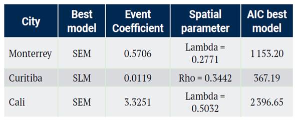 The SLM model is particularly useful when it is assumed that the level of violence in a territorial unit (such as a neighbourhood or a commune) is directly influenced by the levels of violence in neighbouring units. This approach captures a spatial feedback effect, characteristic of contexts in which disputes over the control of illegal markets or the presence of armed groups generate patterns of territorial diffusion of crime (Biagi & Detotto, 2014; Lee & Lee, 2020). The SEM model, on the other hand, is appropriate when the error is expected to be spatially correlated, i.e. there are unobserved factors that simultaneously affect contiguous units.