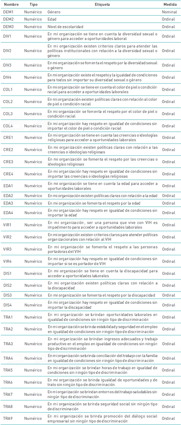 La presente investigación tiene como objeto analizar la discriminación laboral como factor de riesgo para la sostenibilidad del trabajo digno o decente. Para dar cuenta del fenómeno de investigación se construyó un instrumento de recolección de información con aspectos demográficos y con las siguientes siete categorías: i) diversidad sexual o género (DIV); ii) color de piel o racial (COL); iii) creencias o ideologías religiosas (CRE); iv) edad (EDA); v) virus de la inmunodeficiencia humana (VIR); vi) discapacidad (DIS) y vii) trabajo digno o decente (TRA). En la tabla 1 se presenta el instrumento para la recolección de la información.