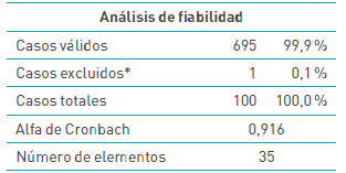 Esta se calculó con un estadístico llamado Alfa de Cronbach, el cual permitió medir la confiabilidad del instrumento para la recolección de la información que posteriormente fue analizada estadísticamente. El Alfa de Cronbach obtenido fue de 0,916, debe tenerse presente que en una escala de 0 a 1, significa que el instrumento tiene un alto grado de confiabilidad, toda vez que los valores que están cerca de 1 significan que tal condición es confiable (Cupani, 2012). En la tabla 2 se puede visualizar la prueba de confiabilidad del instrumento diseñado para la recolección de la información.