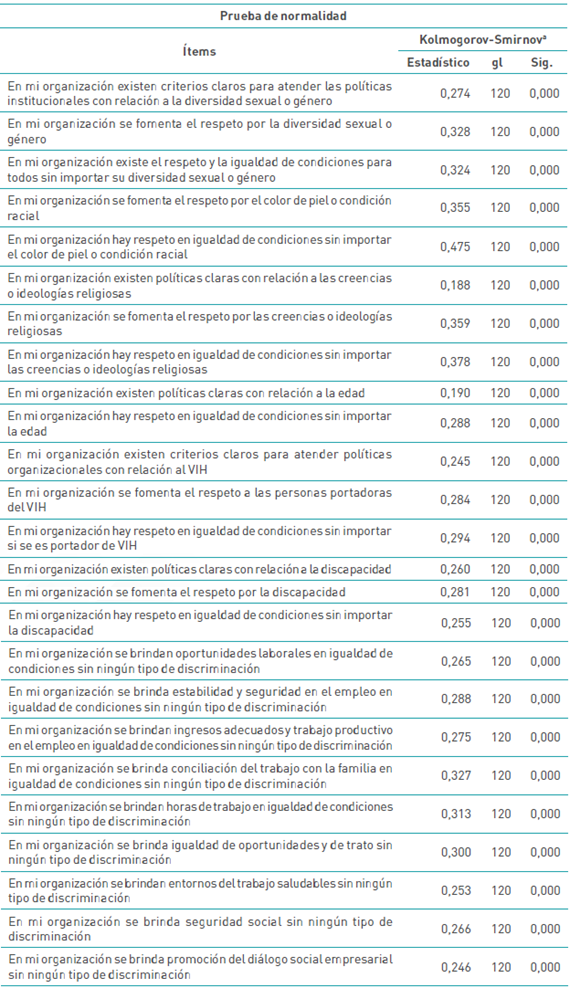 Nota. aCorrección de significación de Lilliefors. Normalidad del instrumento de recolección de información. Datos tomados de SSPS resultados de investigación.