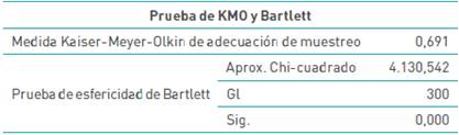 El KMO obtenido de 0,691 muestra una correlación aceptable entre las variables objeto de estudio. Por su parte, el Chi-cuadrado relativamente bajo de 4.130,542 y el p-valor de 0,000 (prueba de Barlett) indican que las dimensiones se pueden factorizar para realizar análisis estadísticos.