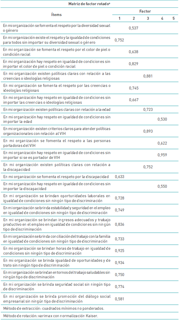 La factorización de las dimensiones se hizo mediante el método de extracción de mínimos cuadrados no ponderados y el método de rotación varimax, los cuales se adaptan mejor a pruebas no paramétricas para dimensiones que no cumplen la condición de normalidad. Como resultado se obtuvo que el 72,9 % de la varianza total es explicada por cinco factores que reagrupan los descriptores de las categorías por homogeneidad de las varianzas con valores superiores al 0,50. Las concentraciones de las varianzas se presentan en la tabla 5.