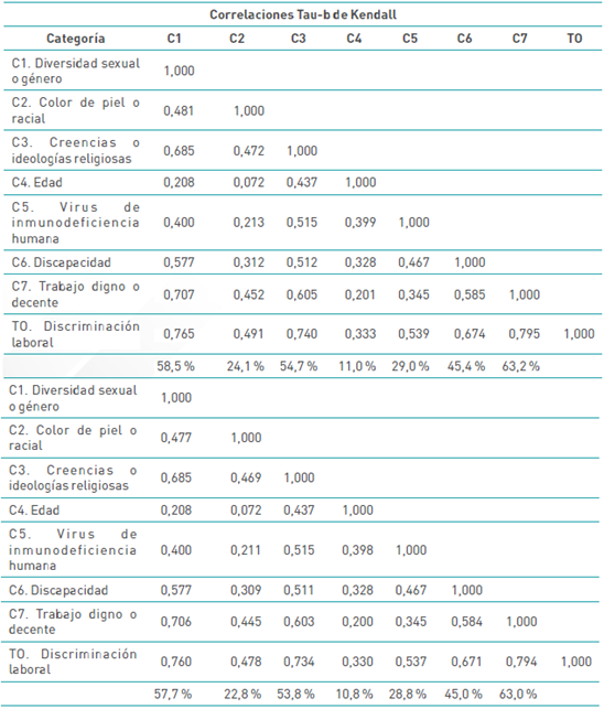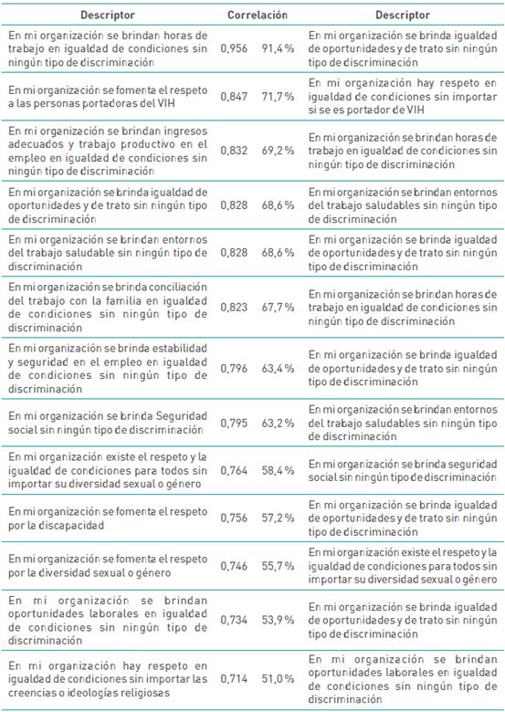 Según los datos de la tabla anterior, las correlaciones no paramétricas más representativas entre los descriptores de la discriminación laboral están en un rango entre 51,0 % y 91,4 %. En efecto, existen correlaciones significativas entre la igualdad en las horas de trabajo y el trato sin discriminación; entre el respeto por las personas con VIH y la igualdad de condiciones sin importar si es portador de VIH; entre los ingresos adecuados y la igual de condiciones laborales sin discriminación. Y con menos incidencia entre la igualdad de condiciones sin discriminación religiosa y las oportunidades laborales sin discriminación; entre las oportunidades laborales sin discriminación y la igualdad de trato sin discriminación; y entre el respeto por la diversidad sexual y la igualdad de condiciones sin importar la diversidad sexual.