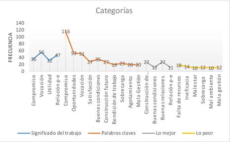 Figura 2 Frecuencias de las categorías por preguntas: significado, palabras clave, lo mejor y lo peor del trabajo