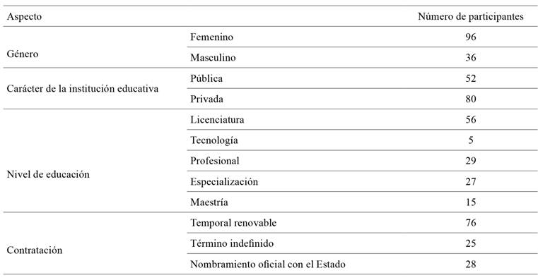 Se contó con la participación de 132 profesores de enseñanza básica y media, los cuales pertenecían a instituciones educativas públicas y privadas de la ciudad de Cali (ver tabla 1). La selección de la muestra fue por conveniencia, que, de acuerdo con Casal y Mateu (2003), consiste en la elección por un método no aleatorio, que limita la representatividad de la muestra, pero que el alcance de la presente investigación permite profundizar en los hallazgos obtenidos y no en la generalización de los mismos. Se tuvieron en cuenta los siguientes criterios de inclusión: (a) ser profesor de cualquier materia en nivel de educación desde transición, primaria, secundaria (sexto a noveno) y bachillerato (grado décimo y undécimo), (b) tener entre dos o más años con el mismo tipo de contrato, y (c) más de un año de vinculación en la institución educativa.