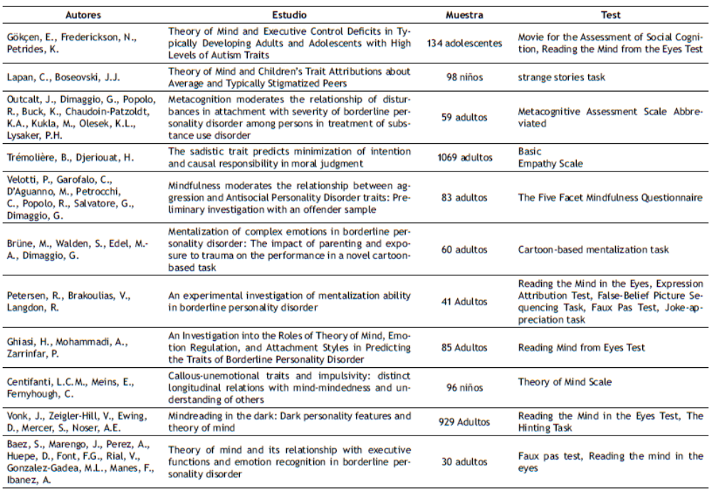 Queda claro que el principal objetivo en los artículos fue estudiar posibles relaciones de la ToM con los trastornos de personalidad, y con rasgos disfuncionales que estuviesen relacionados con la impulsividad y con las conductas de daño o de exclusión social hacia los demás. En los estudios se confirmó la relación de deterioro de la ToM en personas con trastornos de personalidad (Ruiz-Tagle et al., 2015), en especial con el trastorno Límite, antisocial, narcisista, esquizoide y evitativo (Hengartner et al., 2013). Frente a la impulsividad también se obtuvieron hallazgos, encontrando relación entre la ToM y las conductas agresivas (Centifanti et al., 2015; Sharp & Vanwoerden, 2014; Stellwagen & Kerig, 2013; Velotti et al., 2016). En lo referente a la exclusión social, pudo hallarse una relación entre ambas variables donde se menciona que menores puntuaciones de ToM muestran mayores fenómenos de exclusión social inclusive desde etapas tempranas del desarrollo (Lapan & Boseovski, 2015).