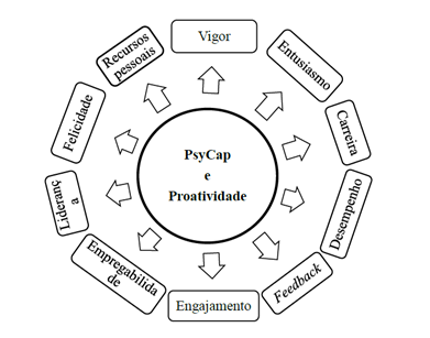 De modo geral, a Proatividade apareceu associada a todas as dimensões do PsyCap. Alguns estudos mencionam as dimensões individualizadas do PsyCap e outros tratando-o como um PsyCap geral ou total com relação de mutualidade com a Proatividade (Chen, 2013; Klemme Larson & Bell, 2013). O PsyCap pode caracterizar a Proatividade no trabalho com impacto na carreira (Van Veldhoven & Dorenbosch, 2008). As ações proativas influenciam o nível de cada componente do PsyCap em benefício do desempenho individual (Andri et al., 2019; Grant & Ashford, 2008).
