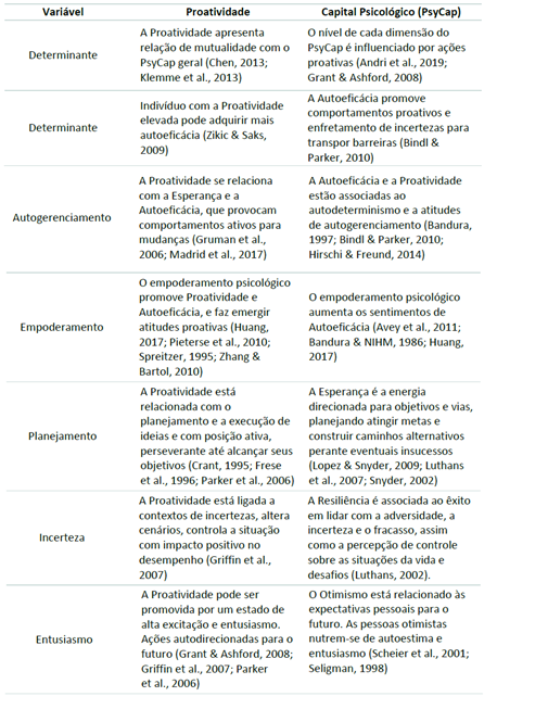 Diante do exposto, a seguir, a Tabela 2 ilustra os principais debates e relações conceituais entre a Proatividade e o PsyCap.