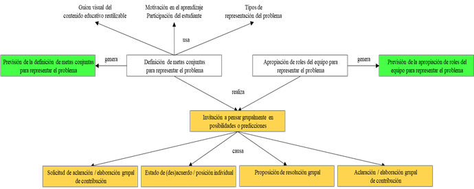La Figura 1 destaca la orientación del episodio analizado hacia la definición de metas conjuntas y la apropiación de roles del equipo para representar el problema, y a su previsión. Estos, subprocesos específicos de representación del problema y su planeación metacognitiva social. En la parte superior indica los conceptos usados en el episodio, a saber, guion visual del contenido educativo reutilizable, motivación en el aprendizaje, participación del estudiante, y tipos de representación del problema. En la parte inferior, se indica el acto discursivo de invitación a pensar grupalmente en posibilidades o predicciones, generador de otros actos discursivos. Estos actos discursivos de mayor frecuencia, presentes en el episodio, permitieron la interpretación de las acciones sociales.