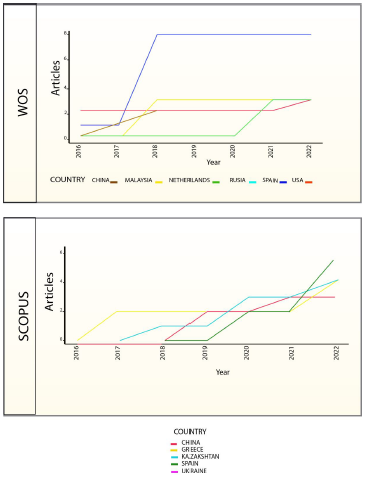 The selected sample for this study shows a 2,65 average age, there are 141 authors, and only 9 articles were written by individual researchers. Spain, Malaysia, China, and Kazakhstan have produced most of the articles in the target knowledge field, being Spain the one that maintains an average of 8 articles from 2018 to 2022, with Kazakhstan increasing its rate to 6 articles in the last year.