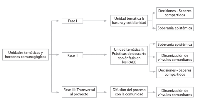 Esta es la fase de desarrollo del proyecto que buscó reconocer el problema socioambiental que representan las prácticas del descarte con énfasis en los RAEE a través de una unidad temática (Figura 3) que problematizó la gestión de los RAEE a nivel global. Los estudiantes tenían conocimientos previos de los RAEE debido a que en el semillero ya se habían reutilizado estas materialidades para la creación de prototipos. Los horcones propuestos fueron: soberanía epistémica, decisiones-saberes compartidos y dinamización de vínculos comunitarios.