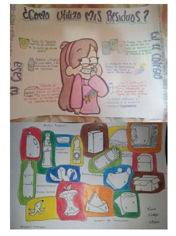 En el taller de conocimientos previos (Figura 2) a través de los relatos de los estudiantes, se conoció sobre su relación con la basura en el colegio, hogar y barrio. Se indagó por los conocimientos previos de los estudiantes sobre prácticas de descarte, producción y manejo de residuos, como punto de partida del proceso pedagógico. En este sentido, se otorgó gran importancia a propiciar las compartencias a través de los talleres en clase y las reflexiones. Se utilizaron recursos TIC como infografías, presentaciones, videos y la plataforma Edmodo.