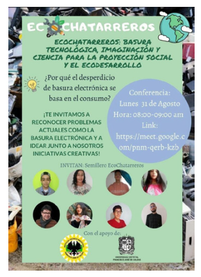 Si bien EcoChatarreros ya venía funcionando, el proyecto pedagógico en EA se desarrolló a lo largo de 2020 por lo cual se estructuró con las características de trabajo dadas por las estrategias de mitigación de la pandemia. Se realizó en conjunto con dos estudiantes de la licenciatura en ciencias sociales de la Universidad Distrital, quienes se vincularon al semillero en el marco de la práctica pedagógica que hace parte de su programa curricular, pero en este caso enfocada en la pedagogía del descarte. Esta alianza fortaleció la perspectiva social del semillero a través del reconocimiento de los problemas socioambientales ocasionados por las prácticas de descarte. Así, se construyó un componente formativo de corresponsabilidad social y valores ambientales en los estudiantes, en relación a sus capacidades innovadoras.