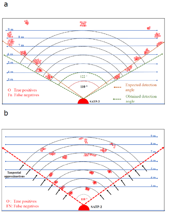 As mentioned earlier, the prototype SATP-2 was first tested indoors. During ten walking trials conducted by the subject, the system accurately detected 112 events within the detection cone while erroneously detecting 8 events (see Figure 10a). This resulted in a hit rate of 93%. Under the high-intensity light conditions of the hall, the system exhibited proper functioning with a wider detection angle than expected. This behaviour, influenced by varying radiation conditions (Xing et al., 2024), suggests the possibility of similar performance outdoors during daylight.