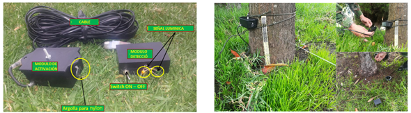 Its functioning relies on a simple principle: changes in the nylon determine whether to activate a luminous signal in the electronic module. Specifically, tension or strain relief generated by the nylon triggers the electronic module to activate the LEDs, serving as an alarm for the sentinel.