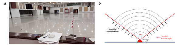 To evaluate the prototype’s detection performance, two tests were designed to assess the detection angle range and distance. The first test was conducted indoors within a hall with high-intensity light, as shown in Figure 7a. Specifically, a subject walked ten times within the system’s detection angle range (110°) at distances between 0m and 9m (see Figure 7b). The second test was conducted outdoors at night, simulating conditions where intruders are more likely to appear during field operations. As in the first test, the subject walked ten times within the system’s detection angle range (110°) at distances between 0m and 9m (Njanda et al., 2024).