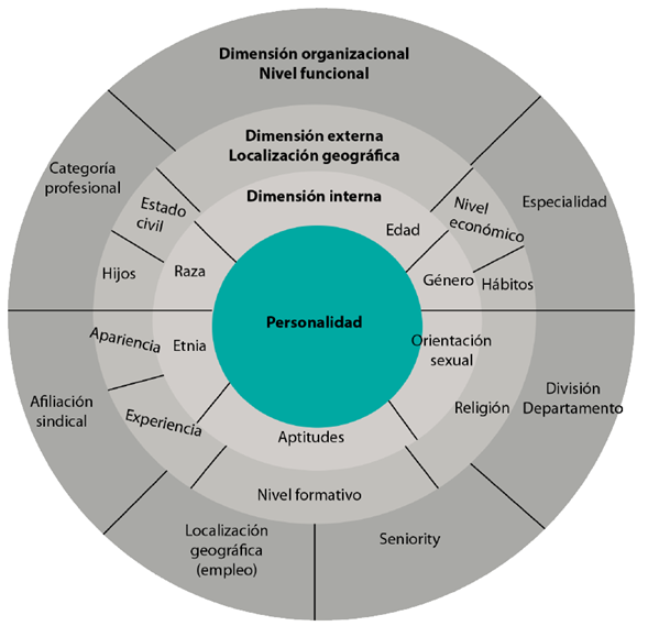 Según Gardenswartz y Rowe (2008), este modelo se compone de cuatro dimensiones y veintidós variables, cuyo fin es reducir la complejidad que encierra la diversidad humana y ofrecer una representación que ilustre las diferencias, centrándose en la personalidad y la influencia que esta tiene en las otras tres dimensiones (interna, externa y organizacional).