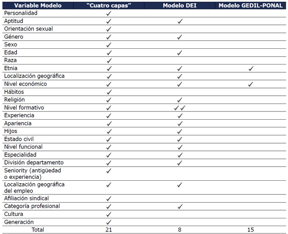 Una vez revisados los modelos “Cuatro capas”, “DEI” y “GEDIL-PONAL”, se evidencia que hace falta reconocer aspectos de la diversidad que a la fecha están nominados y conceptualizados, pero aún no son gestionados integralmente por las áreas de talento humano en el entorno laboral, como se observa en la Tabla 3.