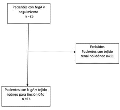 Durante los años 2011 al 2018, 25 pacientes pediátricos con NIgA fueron seguidos en la institución. Catorce pacientes presentaron material histopatológico apto para tinción para C4d. La selección de pacientes se describe en la figura 1.