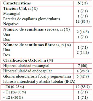 De acuerdo con la clasificación de Oxford, en el 50 % del total de las biopsias renales se encontró hipercelularidad mesangial, seguido por hipercelularidad endocapilar (26.6 %), el 42.9 % mostró glomeruloesclerosis focal y segmentaria, y el 14.2 % fibrosis intersticial y atrofia tubular (IFTA) T1-T2 (tabla 3). Se encontraron dos biopsias con tinción positiva para C4d, una con localización focal en paredes glomerulares y la otra difusa en el área mesangial y paredes glomerulares (figura 2).