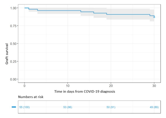 Statistical analysis was performed using R version 4.0.3. Data on mortality and graft loss rate were collected up to day 30 following a positive COVID-19 test. Based on this information, we utilized the Kaplan-Meier curve to estimate graft and patient survival. Additionally, we compared the survival distributions using a log-rank test.