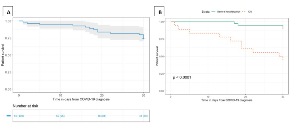 The overall mortality rate was 25.5% (n = 14). The global patient survival was 74.5% after 30 days of follow-up. In the comparison of hospitalization-in-wards and ICU groups, patient survival was significantly higher in KT patients with COVID-19 in the hospitalization-in-wards group versus the ICU group (p = 0.0001) (Figure 2).