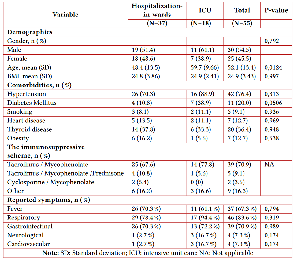 A total of 55 KT patients were analysed during the study period. Most patients were male in both groups (hospitalization-in-wards and ICU). The overall mean age for hospitalized and ICU patients were 48.4 ± 13.5 and 59.7 ± 9.6 years, respectively. There were no significant differences in the bivariate analysis of sex, clinical history of hypertension, smoking, heart disease, thyroid disease, and obesity. The recipient's age and the clinical history of diabetes mellitus had a significant difference between the hospitalization-in-wards and ICU groups in the bivariate analysis (p = 0.0124 and p = 0,0506), respectively. Neurological and cardiovascular symptoms of COVID-19 were more prevalent in ICU patients. Table 1 describes the demographics and clinical characteristics of KT patients with COVID-19. In addition, we evaluated the antibiotic requirement, which was more prevalent in the ICU (77.8%), although there were no significant differences between both groups (p = 0,315).