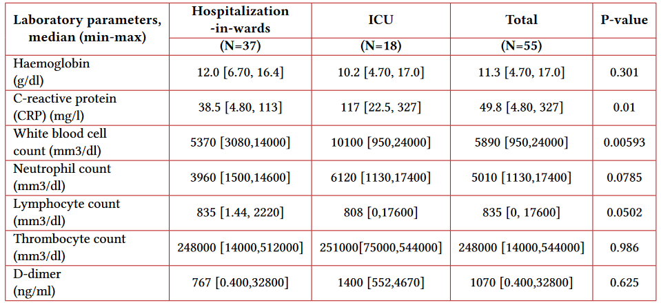 A higher mean level of C-reactive protein (CRP) was noted in KT recipients with COVID-19 in the ICU group compared to KT recipients with COVID-19 in the hospitalization-in-wards group (p = 0.01). In addition, the ICU group had a higher elevation in the mean absolute white blood cell count and neutrophil count than the hospitalization-in-wards group (p = 0.00593 and p = 0.0785, respectively). In terms of lymphocyte count, KT recipients in the ICU group developed a lower mean count than the KT recipients in the hospitalization-in-wards group (p = 0.0502). No significant associations were found for the mean concentration of haemoglobin, thrombocyte count, and D-dimer levels in the bivariate analysis. Laboratory parameters are shown in Table 2.