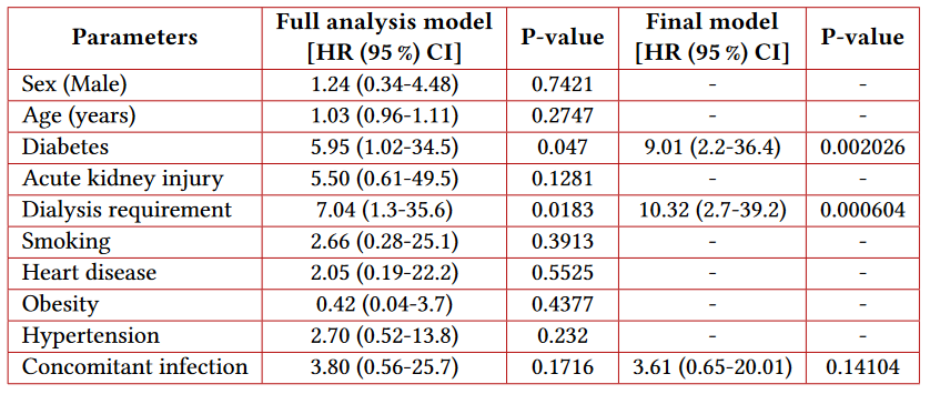 We performed a multivariate Cox analysis to identify risk factors associated with mortality in KT patients within 30 days after COVID-19 positive test. KT recipients with a clinical history of diabetes mellitus (p = 0,002026) and dialysis requirement (p = 0,0006) within the hospitalization-in-wards or ICU stay were significantly associated with risk of death (Table 4).