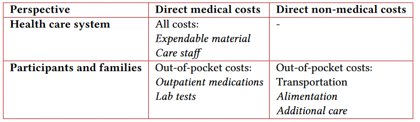 The study has a quantitative approach, whose perspectives measure the costs for the health care system and the participants and their families. Table 1 reflects the cost categories included in each perspective.
