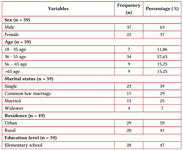 A total of 59 patients with end-stage renal disease (ESRD) receiving hemodialysis therapy participated, for a total of 718 hemodialysis sessions in the study period, 63% of the participants were male (Table 2) and the mean age was 51.42 ± 15.26 years, with a range of 22 to 87 years.