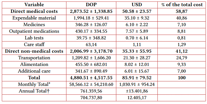 The average cost per hemodialysis session was DOP 4,880.51 ± 4,517.55 (USD 85.91 ± 79.52). Of this, direct medical costs accounted for 50.06% and direct non-medical costs accounted for the remaining 49.94%. The annual cost of hemodialysis therapy is DOP 761,359.56 ± 704,737.80 (USD 13,401.86 ± 12,405.17) (Table 3).