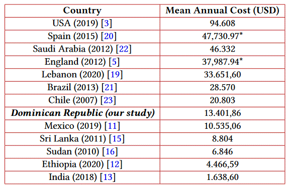The differences in the costs reported by the different studies are very marked. This is explained by the combination of different factors used in other studies, such as the types of costs considered (direct, indirect, intangible), the variation in the costs of medical supplies in different countries, the fees of health care personnel, the accessibility of health care services, per capita health spending by governments, the category of hospitals (public or private), the perspective used (patient, health system, health risk insurers), inflation, among others. For example, in the Dominican Republic and other developing countries, direct non-medical costs can represent up to 50% of the costs, but in developed countries such as Spain, they tend to represent less than 20% (20). Even in the same country, in the same year, there can be a great deal of variability, as is the case in India with the costs reported by Kaur et al (18) and Fathima et al (13) in 2018 (Figure 3).