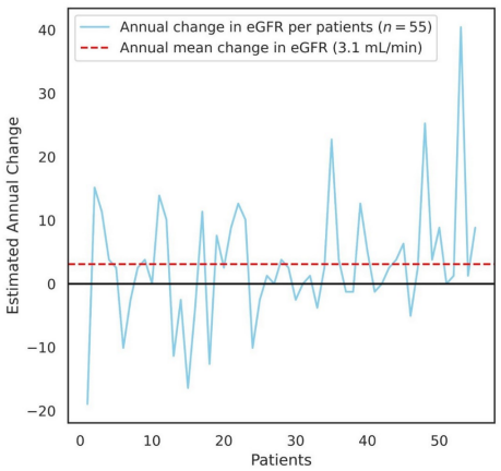 Additionally, the eGFR change (Δ) per year was estimated. As observed in Fig. 1, the mean Δ value of eGFR per year was 3.1 (±9.78) mL/min per 1.73 m2.