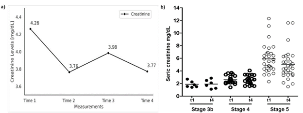 Additionally, to explore the evolution of creatinine by stage of the disease, we divided the group of patients into stages 3b, 4, or 5. Figure 2b shows the trend of creatinine levels in each stage of CKD, revealing a marked reduction primarily in stage 5 patients with an average reduction close to the unit (0.9228 ± 2.2705 mg / dL).