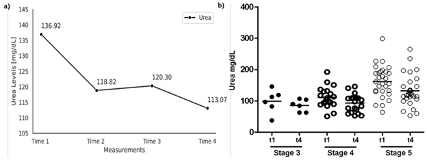 Note. (a) Plasma concentrations of urea in the different evaluation times; t1 represent the basal levels pre-intervention, and t2-t4, represent levels post-intervention; data represent mean values (n=55). (b) Comparison of plasma concentrations of baseline and final urea in the different stages of CKD evaluated.