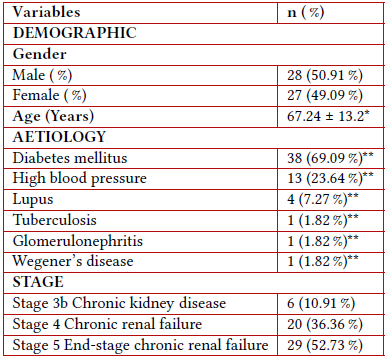 The study included 55 patients with CKD: 27 women (49.1 %) and 28 men (50.9 %). The average age was 67.2 years (±13.2). The age range observed in the study spanned from a minimum of 31 years to a maximum of 88 years. Notably, over half of the patients (50.1 %) were aged over 70 years, underscoring the presence of a vulnerable population within the cohort. Regarding the etiology of CKD, among the most frequent etiologies, 69.1 % of patients had a history of type 2 diabetes mellitus and 23.6 % of systemic arterial hypertension. In relation to the stage of CKD, six patients had stage 3b (10.9 %), while 20 patients (36.36 %) had stage 4 and finally, 29 patients (52.73 %) were classified as stage 5 (Table 1). The patients, on average, underwent treatment for a duration of 11 months throughout the study period.