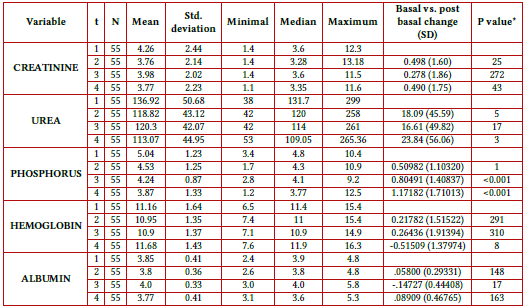 Regarding phosphorus, a significant decrease in each measurement was observed, as depicted in Fig. 4a, going from a baseline of 5.04 mg / dL to a final mean of 3.87 mg / dL. A mean change of 1.17 (±1.7) mg/dL, P<0.05, was verified.