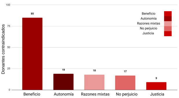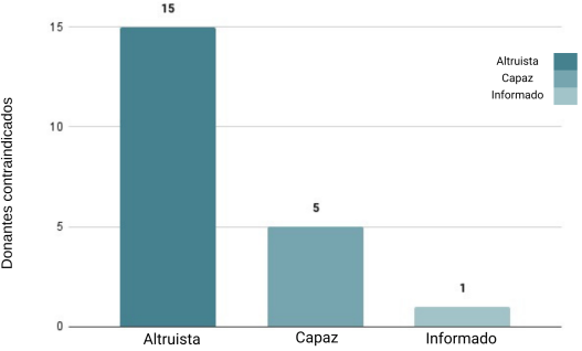 Adicionalmente, se plantearon diferentes hipótesis para explicar nuestros resultados. En primer lugar, es crucial destacar que la contraindicación ética principal se fundamentó en la no existencia de beneficio mutuo, tanto para el donante como para el receptor. En el pasado, la preocupación se limitaba al beneficio de la donación únicamente para el receptor, dado que en algún momento se llegó a afirmar que la donación era un procedimiento sin beneficio para el donante, pero creemos, al contrario, y la literatura actual lo reconoce cada vez más, que resulta éticamente indispensable garantizar que existe un claro beneficio también para el donante [6,12].