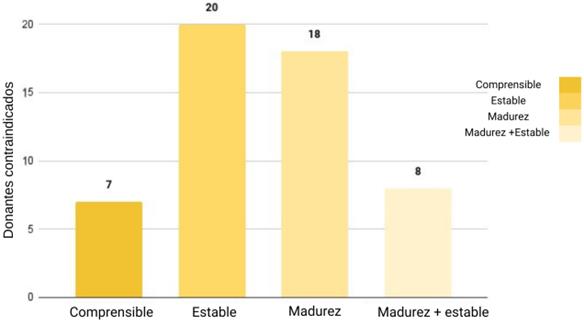 No se encontró una decisión madura en el 34 % de los casos, dado que ambas características (madurez y estabilidad emocional) son fundamentales, pues dentro del proceso de donación pueden presentarse conflictos ambivalentes y hasta arrepentimientos posteriores. La evaluación por salud mental es crucial para determinar que la decisión se basa en emociones maduras. Previamente, otros autores han descrito que las emociones de los donantes oscilan entre el miedo y la esperanza, la dependencia y la independencia [11,14]. Demostrando así que nuestros resultados coinciden con lo publicado en otros contextos y poblaciones de manera consistente.
