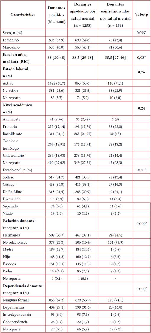Se evaluaron 1488 donantes posibles, de los cuales 166 (11,1 %) resultaron contraindicados en la evaluación por salud mental. De todos los pacientes evaluados, el 53,9 % eran mujeres y la mediana de edad fue de 38 años (edades entre los 29 y los 48 años). También, se identificó que la mayoría de los donantes posibles se encontraban solteros (34,7 %) y la relación donante-receptor más frecuente fue entre hermanos (33,7 % de los casos evaluados). Al considerar la dependencia entre el donante y el receptor, se encontró que el 57,3 % de los pacientes no presentaron ninguna dependencia formal.