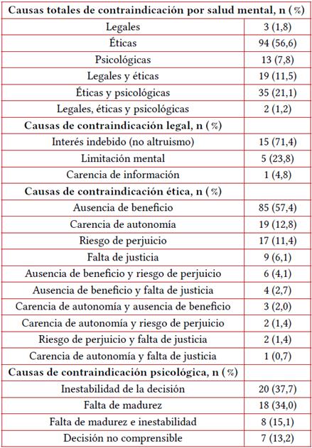 Adicionalmente, se incluyeron otras razones de contraindicación en el ámbito legal combinadas con otras causas, así, 21 personas no cumplieron con los requerimientos legales básicos para la donación de órganos en Colombia, en las cuales, la principal causa fue el interés indebido (no altruismo) para el donante, esto representó al 71,4% de los pacientes. En cuanto a las razones éticas, cerca del 89 % de los donantes se contraindicaron por ello, donde se presentó una mezcla entre los cuatro principios éticos en donación y donde el más frecuente fue la ausencia de beneficio frente a la decisión (57,4 %). Por otro lado, las razones psicológicas fueron causal de contraindicación en 53 casos (31,8 %) y aquí se evidenció que uno de cada cinco donantes evaluados tenía una decisión inestable, es decir, que no se conservaba a lo largo del tiempo. El resumen de las razones para contraindicación se presenta en la tabla 2.