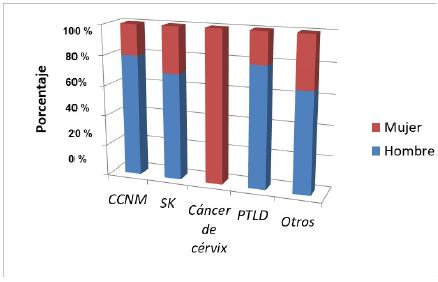 Figura 2 Relación hombre:mujer en términos de porcentaje entre las neoplasias asociadas a TxR en la cohorte