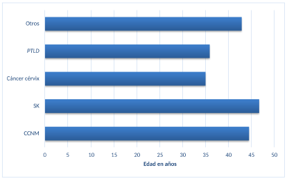 La media de edad para el diagnóstico de cada una de las neoplasias puede observarse en la figura 3; para el SK, la tendencia fue a desarrollarse en pacientes de mayor edad, con un promedio de 48 años, seguido por los otros cánceres, cuya edad promedio fue de 43 años, salvo el carcinoma de cérvix, que afectó a mujeres más jóvenes, con un promedio de 35 años.