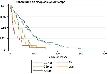 En la curva de Kaplan-Meier (figura 4) puede observarse claramente que, en tres de las neoplasias prevalentes en el postrasplante renal: SK, LNH (que hace referencia a los casos de PTLD) y carcinoma de cérvix, el cuadro de presentación es muy temprano, presentándose usualmente en los primeros 60 meses postrasplante. No sucede lo mismo con las neoplasias de origen cutáneo no melanoma (CCNM), las cuales presentaron una aparición algo más tardía, concordando con el registro de Nueva Zelanda y Australia (Anzdata), donde también se observó una presentación tardía, en promedio a los 69 meses postrasplante [6,7].